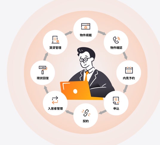 不動産賃貸管理会社向けの業務支援サービスです。物件検索から内見予約、入居申込、賃貸借契約、入居者管理、更新退去手続き、原状回復工事までの一連の業務をテクノロジーで支援し、業務効率化と顧客満足度向上を実現し、不動産業界のペーパーレス化に貢献しています。また、オーナー満足度を向上させる不動産基幹システムとして、精算管理、物件管理、家主管理などの業務支援が可能です。