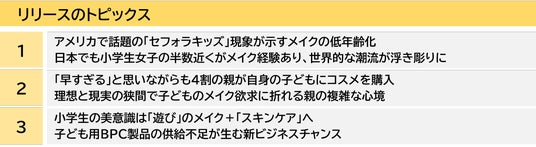 また、子ども用のメイク製品というと玩具メーカーの製品も少なくありませんが、スキンケアもメイク製品も、大人用ではなく、子どもならではのニーズと興味に合わせたBPCメーカー開発のアイテムのさらなる登場が期待されます。