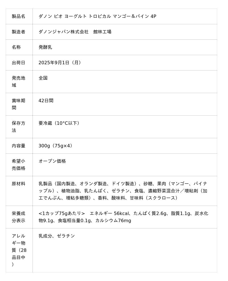ダノンジャパン株式会社(本社:東京都目黒区、代表取締役社長:ロドリゴ・リマ)は、100倍胃酸に強く※1、生きて腸まで届くBE80菌を配合した「ダノン ビオ(R)」ブランドより、「ダノン ビオ ヨーグルト トロピカル マンゴー&パイン」を新発売します。当製品は、ジューシーでとろけるマンゴーと熟れた甘いパイナップルを贅沢に組み合わせた、南国気分あふれる一品です。2025年9月1日(月)より、全国のスーパーマーケット向けに出荷を開始します。