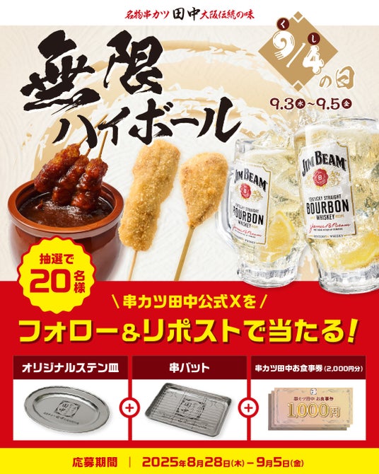 株式会社串カツ田中ホールディングス(本社:東京都品川区東五反田、代表取締役社長 CEO:坂本 壽男)が展開する串カツ田中は、9月3日(水)~9月5日(金)の期間限定で毎年恒例の「串(94)の日」キャンペーンを実施します。