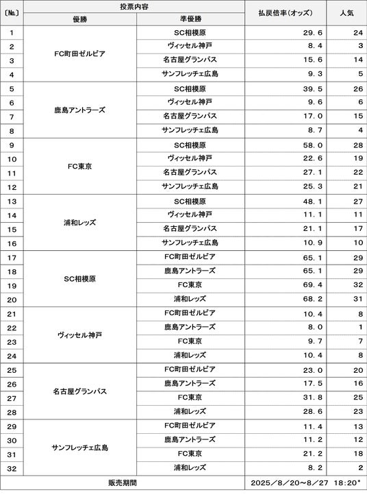 優勝・準優勝チームや決勝カードを予想する競技会予想くじ 8月27日(水) 18:20まで*