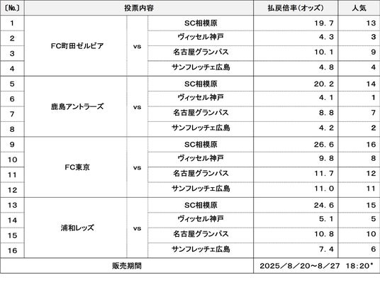 ※1 8月26日(火)10時時点の投票状況となります。払戻倍率(オッズ)は、投票状況により販売終了まで変動します。払戻倍率(オッズ)は、スポーツくじオフィシャルサイト(https://www.toto-dream.com/)で随時更新しています。