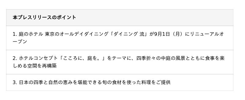 野村不動産ホテルズ株式会社(本社:東京都港区/代表取締役社長:石井康裕、以下「当社」)が運営する「庭のホテル 東京(以下「庭のホテル」)」のオールデイダイニング 「ダイニング 流(りゅう)」(以下「ダイニング流」)は、約1か月の改装工事を経て、2025年9月1日(月)にリニューアルオープンいたします。