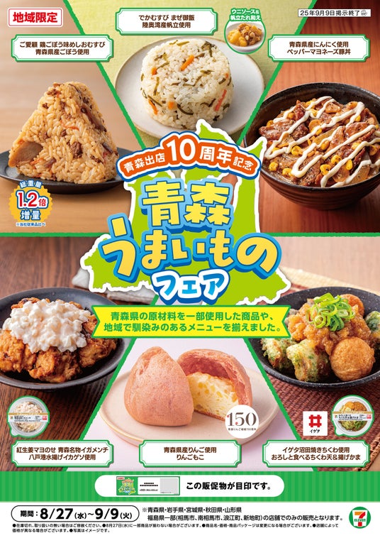株式会社セブン‐イレブン・ジャパン(本社:東京都千代田区、代表取締役社長:阿久津 知洋)は、青森県の地産地消の推進の取り組みを支援する「青森うまいものフェア」を2025年8月27日(水)から9月9日(火)の14日間限定で、青森県や岩手県、宮城県、秋田県、山形県および福島県のセブン‐イレブン店舗で開催いたします。