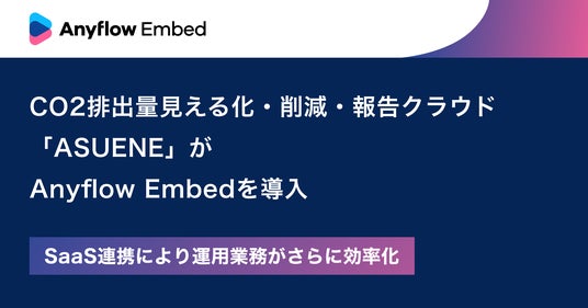 Anyflow株式会社(本社:東京都港区、代表取締役CEO:坂本 蓮、以下「Anyflow」)は、当社が提供するSaaS事業者向けAPI連携プラットフォーム「Anyflow Embed」が、アスエネ株式会社(本社:東京都港区、代表取締役:西和田浩平、以下「アスエネ」)のCO2排出量見える化・削減・報告クラウド「ASUENE」に導入されたことをお知らせいたします。