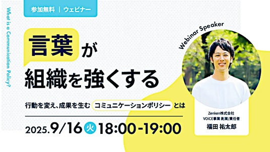 Zenken株式会社(本社:東京都港区、代表取締役社長:林 順之亮、以下 Zenken)は、2025年9月16日に「チームのコミュニケーションポリシー」をテーマとしたウェビナーを無料開催いたします。