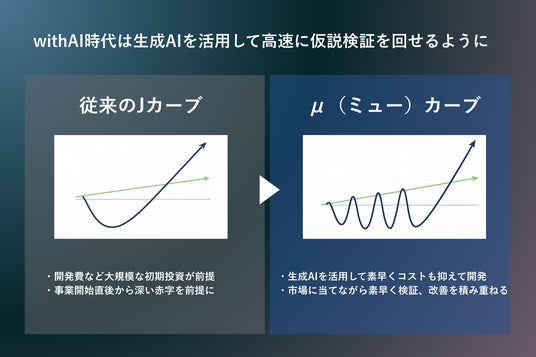 近年、新規事業の9割以上が失敗すると言われる中、多くの企業が「長期間の投資後に市場ニーズがない」という課題に直面しています。特に、企画書段階での判断や、実際のユーザーの声を聞かない開発、市場ニーズの検証不足が主な失敗要因となっています。生成AI技術の発達により、プロダクト開発の民主化が進む一方で、「いかに早く市場に当て続けるか」が新時代の成功法則となっています。従来のJカーブ型(長くて深い投資期間)から、小さな波を繰り返すμ(ミュウ)カーブ型への転換が求められています。創業期のスタートアップや大企業の新規事業支援を10社以上させていただく過程で、より早くコンパクトに検証スピードを最大化できるプランとして本プランをリリースいたしました。