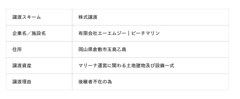 事業承継・M&Aマッチングプラットフォーム「TRANBI(トランビ)」を運営する株式会社トランビ(本社:東京都港区、代表取締役:高橋聡)は、岡山県倉敷市のピーチマリン(有限会社エーエムジー)が実名掲載の形で後継者募集を開始したことをお知らせいたします。