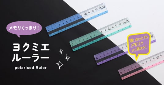 「ヨクミエルーラー」(10月発売)はメモリの下に特殊印刷を施すことで、濃い色の上や白地に印刷された物の上でもメモリが見やすい直定規(15cm)です。日々の学習や工作はもちろん、定規を使うさまざまな日常シーンにおいて「メモリが背景色と同化して見えづらい」といった不満を解消してくれるアイテムとなっています。