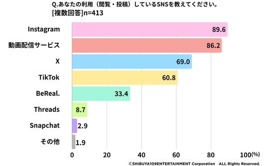株式会社SHIBUYA109エンタテイメント(本社:東京都渋谷区、代表取締役社長:石川 あゆみ)が運営する若者マーケティング機関『SHIBUYA109 lab.(読み:シブヤイチマルキュウラボ)』は、15~24歳の女性413名を対象に、外部調査パネルによるWEB調査とSHIBUYA109 lab.独自ネットワークによるインタビューから「Z世代のSNS利用最新動向2025」を行いました。