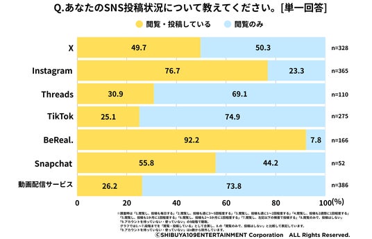 さらに、各プラットフォームを利用している人の投稿・閲覧状況について質問したところ、BeRealは利用者の92.2%が閲覧のみではなく投稿も行っていることがわかりました。これはBeReal.の “投稿しないと他の人の投稿が閲覧できない” 仕様が影響していることも考えられます。BeReal.以外では、Instagram、X、SnapchatがアクティブなSNSであることがわかりました。(図3)