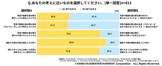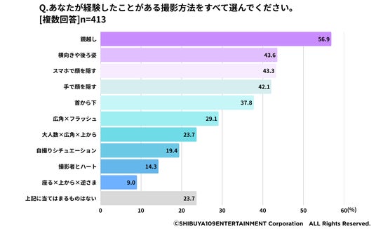 鏡越し(56.9%)や横向き・後ろ姿(43.6%)、スマホで顔を隠す(43.3%)などの撮影方法を経験した人はいずれも半数近くおり、自分の写真を撮影するにあたって、自分の姿がすべて映ることは当たり前ではなくなっていることがわかります。(図10)