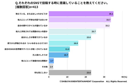 そんな彼らがSNSに投稿する際にZ世代が意識していることについて調査してみると、「映えている、またはおしゃれかどうか(35.1%)」「他人にとって不快な内容ではないか(33.7%)」「自分の顔やスタイルが盛れているか (33.2%)」が上位となりました。SNSで映える投稿であるかなど、好意的に見られるかどうかが気にされる一方で、他人が不快に感じないかにも気を遣っていることがわかります。(図5)