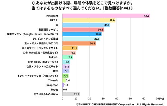 また、「あなたがお出かけする際、場所や体験をどこで見つけますか」という質問に対してはInstagram(64.6%)、TikTok(39.0%)、X(35.1%)、動画配信サービス(30.5%)、検索エンジン(28.8%)の順で多くなっています。(図8)