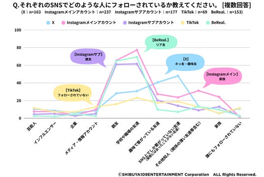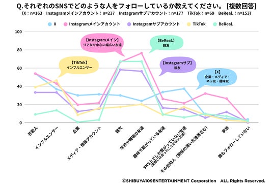 また、各SNSのフォローしている人・されている人について聞いてみると、InstagramやBeReal.はオフラインで知り合った友人が一番多くそれに対してTikTokは、インフルエンサーをフォローしていることが多く、Xは企業や趣味で繋がる友だち・SNSで繋がった友だちをフォローしていることが多いことがわかりました。(図4)
