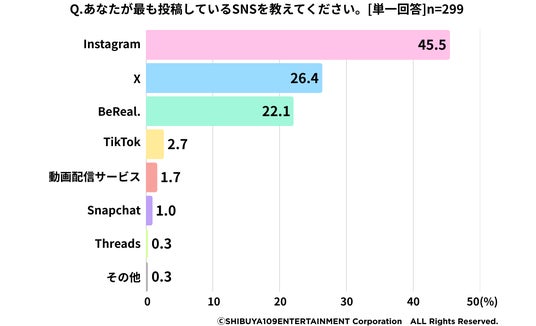 また、各プラットフォームのうち最も投稿しているSNSについて質問したところ、最も多かったのはInstagram(45.5%)次いで、X(26.4%)、BeReal.(22.1%)となりました。