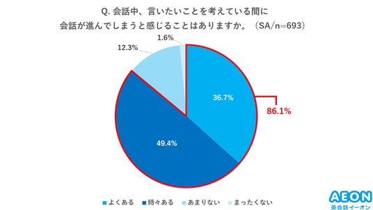 英語での会話中、言いたいことを考えている間に会話が進んでしまうと感じることはあるか尋ねたところ、「よくある」「時々ある」と回答した人の割合は合計で86.1%に上る結果となりました。多くの人が会話のスピードについていくことや、自分の意志を即座に伝えるコミュニケーションスキルが不足していることがわかりました。