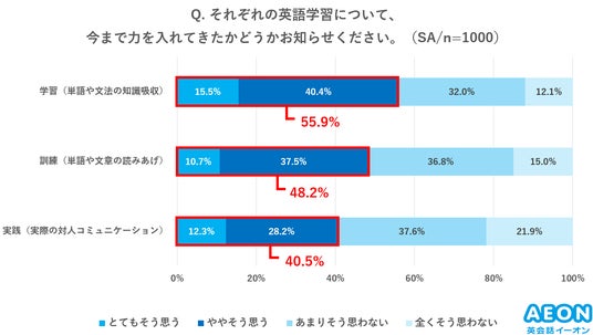英会話スキルの習得にあたり、「学習(単語や文法の知識吸収)」「訓練(単語や文章の読みあげ)」「実践(実際の対人コミュニケーション)」の各項目に対して今まで力を入れてきたか尋ねたところ、「学習」に対して「とてもそう思う」「ややそう思う」と回答した人の割合は合計で55.9%と最も高い結果となりました。一方で、「実践」に対して「とてもそう思う」「ややそう思う」と回答した人の割合は合計で40.5%と、「学習」と比較して約15ポイント低い結果となり、、多くの英語学習者が知識のインプットに重きを置いてきたものの、実際の対人コミュニケーションを通じたアウトプットの優先度は低い傾向にあることがわかりました。