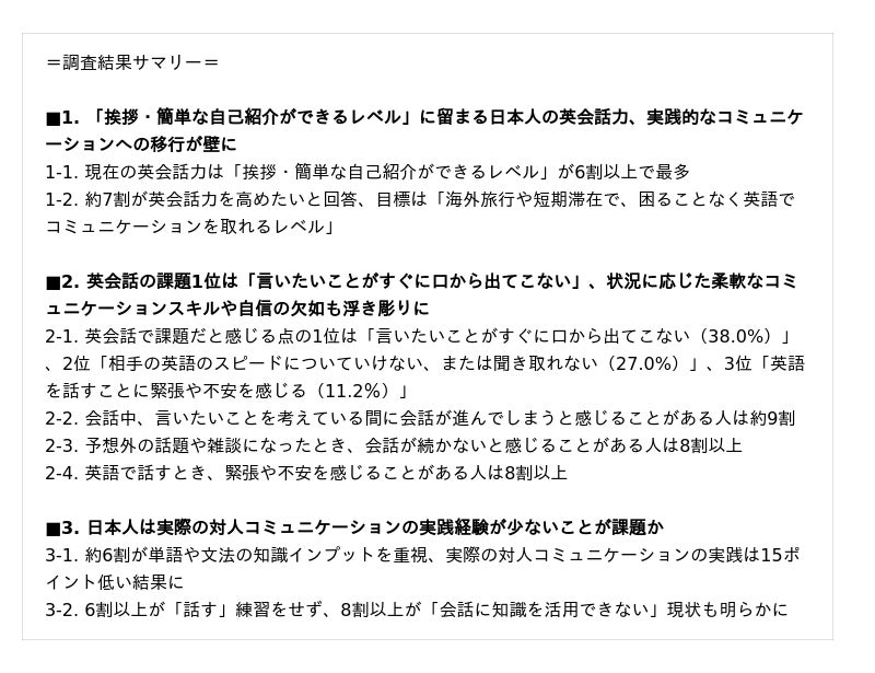日本人の英会話力、6割以上が「挨拶・簡単な自己紹介レベル」と回答 6割以上が「話す」練習せず、対人コミュニケーションの実践経験に課題