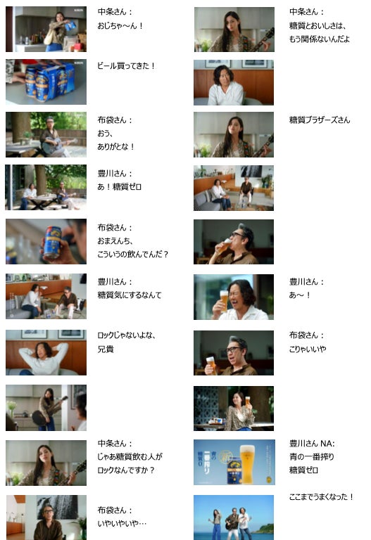 姪っ子が買ってきた糖質ゼロビールを見て、「こういうの飲んでんだ?」と尋ねた布袋さんに、「糖質気にするなんて、ロックじゃないよな~兄貴」と応じる豊川さん。そこへギターを抱えた中条さんが「ジャン♪」と弾いて2人の会話に割って入ります。「じゃあ糖質飲む人がロックなんですか?」「糖質とおいしさはもう関係ないんだよ、“糖質ブラザーズ”さん」と鋭い一言を投げ掛ける中条さん。それをきっかけに、豊川さんと布袋さんがさらにおいしく進化した「一番搾り 糖質ゼロ」を飲みます。共に同い年で20年以上の交流があり、お互いを「親友」と語る豊川さんと布袋さんの掛け合いをはじめ、糖質ゼロビールのおいしさに懐疑的な兄弟を“糖質ブラザーズ”と命名し、布袋さんもびっくりなロック魂?を炸裂させる中条さんの堂々たる立ち居振る舞いは必見です。さらに、ひと口飲んで「こりゃいいや」とそのおいしさを認めた伯父と、うれしそうに「一番搾り 糖質ゼロ」を飲む父娘の豪華な3ショットなど、3人の仲の良さが微笑ましい、見どころたっぷりの新CMを お楽しみください。