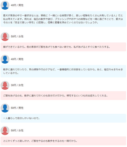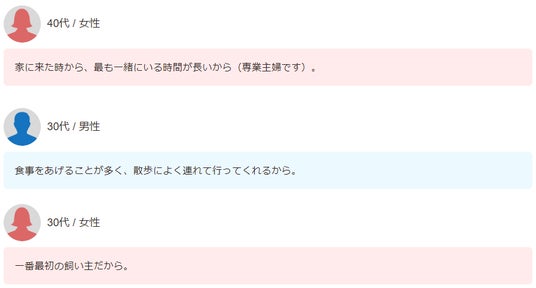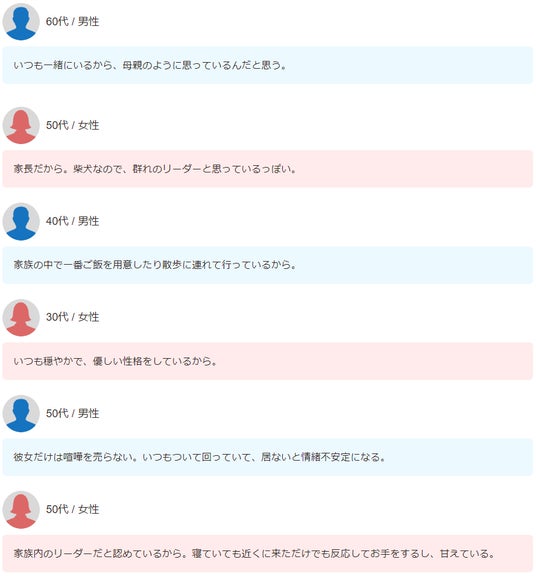 また「最初に迎え入れてくれた人だから」という意見もあり、犬にとって特別な存在になっていることがうかがえます。