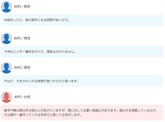 さらに「子供が愛犬を溺愛しているので、愛犬も守られていると感じている」という意見もあり、深い愛情が絆を強めている様子がうかがえます。