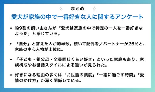 一方で、子どもや祖父母が選ばれたり「全員同じくらい好き」という回答も10%あり、家庭ごとの関わり方やワンちゃんの性格による違いも存在しました。