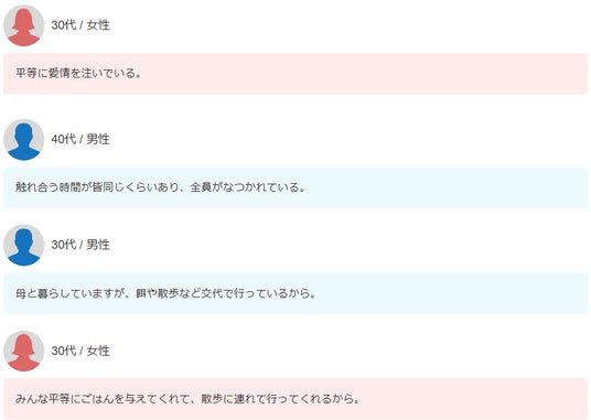 「全員同じくらい好き」と答えた家庭では、食事や散歩を家族で交代しながら行い、日常的にみんなが関わっている様子が見られました。