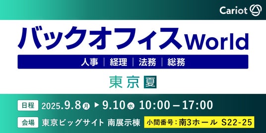 株式会社キャリオット(本社:東京都港区、代表取締役社長 齋藤 洋徳)は、2025年9月8日(月)から10日(水)、東京ビッグサイト南展示棟で開催される「バックオフィスWorld 2025 夏 東京」に出展します。