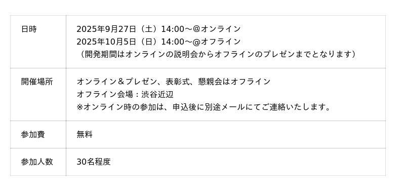 本ハッカソンは、生成AIをはじめとしたAI技術の実務的な活用をテーマに、1週間でプロダクトの開発と発表を行うイベントで、企業からのフィードバックを通じて、参加者が “スキルを実装に変える” 体験を得られる場として実施します。