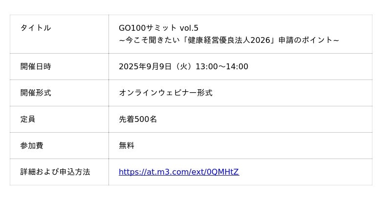 疾病予防を通じて豊かな未来を目指す取り組み「ホワイト・ジャック・プロジェクト」を推進するエムスリー株式会社(本社:東京都港区、代表取締役:谷村 格、以下「エムスリー」)は、企業の健康経営(R)を支援する事業の一環として、2025年9月9日(火)にオンラインカンファレンス『GO100サミット vol.5 ~今こそ聞きたい「健康経営優良法人2026」申請のポイント~』を開催いたします。