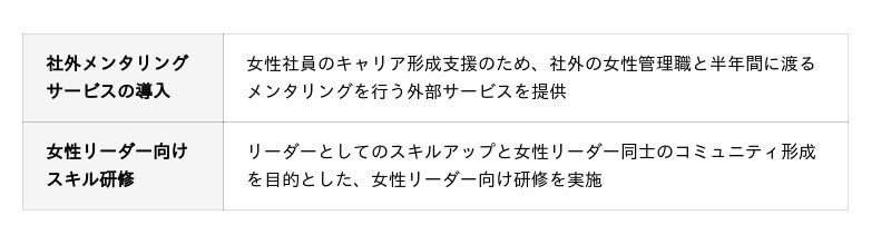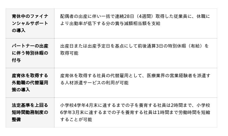 具体的には、男性社員の育児参加を後押しするため、育休取得による賞与減額分を補填する制度を新たに導入し、取得率の向上を図っています。また、外勤職の産育休取得に際しては、医療業界経験者の派遣による代替要員の確保を進め、現場の負担軽減と育休取得の両立を実現しています。さらに、女性社員のキャリア支援として、社外の女性管理職によるメンタリングサービスを導入し、将来を見据えた成長の機会を提供しています。