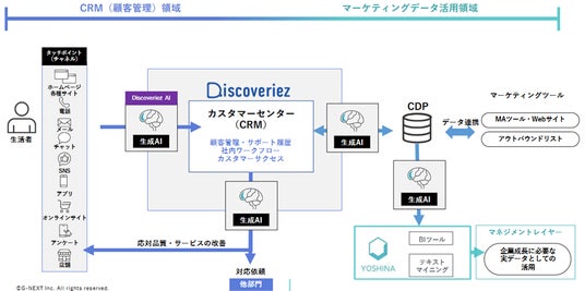 ジーネクストでは、顧客対応窓口をはじめとした、企業を取り巻くステークホルダーのDXを支援するプラットフォーム「Discoveriez」にて、顧客対応内容を記録し、顧客データの的確な管理を実現しており、対応時間の短縮および顧客データの正確な管理をも取られる一方、人材不足といった大きな課題解決が顕在化しており、加えてこれらの課題を解決するために、生成AIを活用し、コールセンターのDX化を推進する「Discoveriez AI」としてサービス化しております。https://discoveriez.jp/
