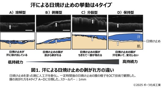 ポーラ・オルビスグループの研究・開発・生産を担うポーラ化成工業株式会社(本社:神奈川県横浜市、社長:片桐崇行)は、横浜国立大学と共同で汗で日焼け止めが肌から剥がれる様子を可視化する新たな技術を開発(※1)し、日焼け止めの汗による剥がれ方は4つに類型化されることを発見しました。この発見により、日焼け止めが剥がれるメカニズムの解明が進み、心地よい感触でありながら汗に強い新たな日焼け止めを開発することが可能となります。