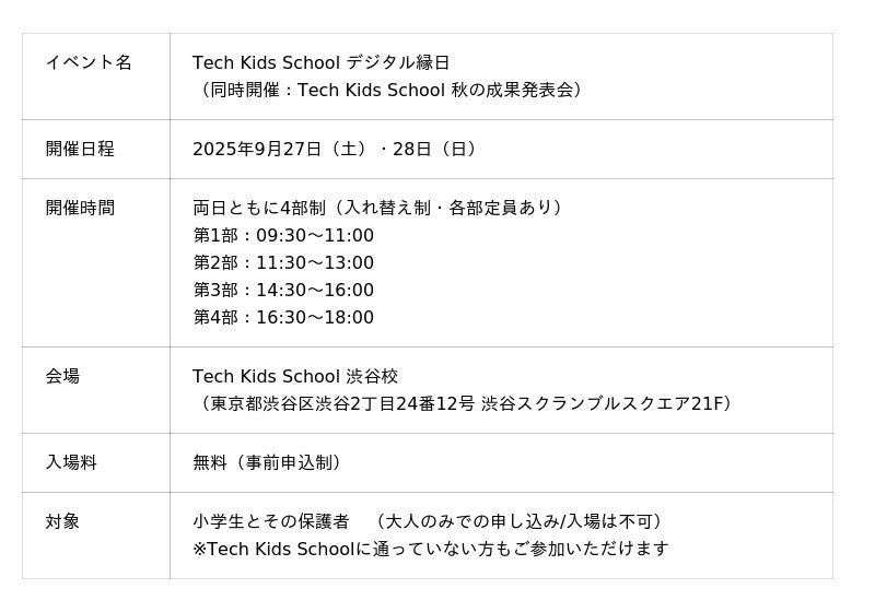 株式会社CA Tech Kids(本社:東京都渋谷区、代表取締役社長:上野朝大)は、運営する小学生のためのプログラミングスクール「Tech Kids School」において、親子で楽しめる体験型イベント「Tech Kids School デジタル縁日(同時開催:Tech Kids School 秋の成果発表会)」を、2025年9月27日(土)・28日(日)の2日間にわたり開催することをお知らせいたします。