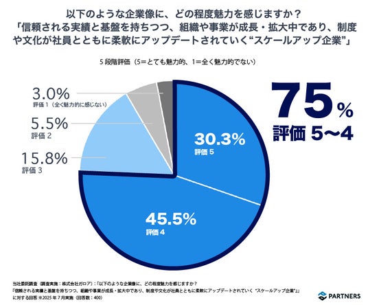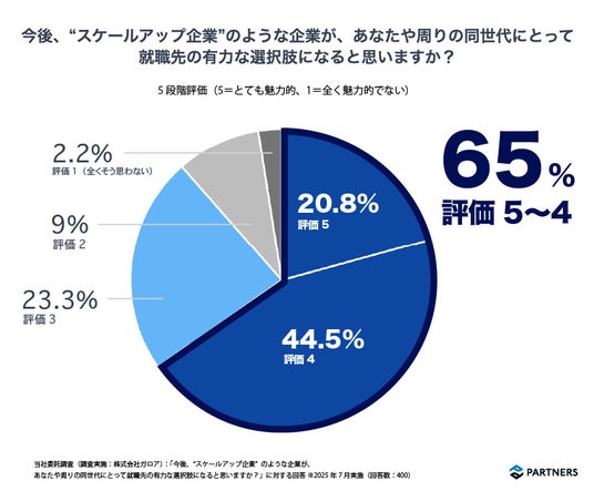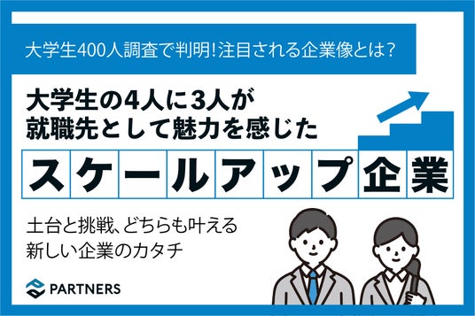 資産運用総合アドバイジングカンパニーの株式会社パートナーズ(本社:東京都港区、代表取締役:吉村 拓、以下「当社」)は、難関大学の在学生※400名を対象に実施した就職観に関する意識調査の結果を公表いたしました。本調査により、これまで対立軸とされていた「安定」と「挑戦」を“両立”できる企業像が、次世代の社会人から新しい選択肢として強く支持されていることが明らかになりました。なかでも、実績と成長性を兼ね備え、組織と個人が共に進化する「スケールアップ企業」という概念は、特に高い関心と評価を集めています。