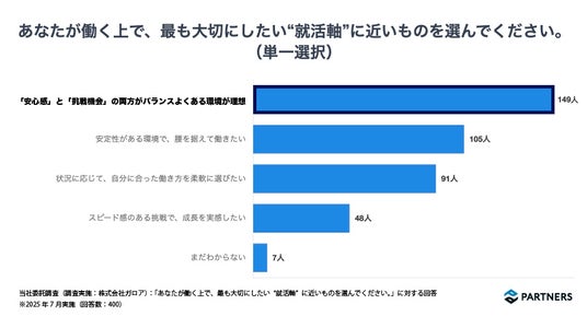 「あなたが働く上で、最も大切にしたい“就活軸”」を尋ねたところ、「安心感と挑戦機会のバランスが取れた環境が理想」という選択肢が最も多く選ばれました。