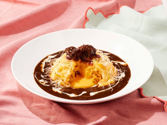 ケチャップライスの中にはゴーダ、モッツァレラ、ステッペン、チェダーをあわせたコクのあるチーズが隠れており、濃厚なビーフシチュー、ふわとろなオムライスと一緒に至福の味わいをご堪能いただけます。