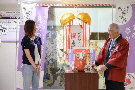 「べらぼう 江戸たいとう 大河ドラマ館」の来館者が10万人を達成しました。10万人達成を記念し、台東区大河ドラマ「べらぼう」活用推進協議会から、10万人目の来館者に記念品を贈呈しました。