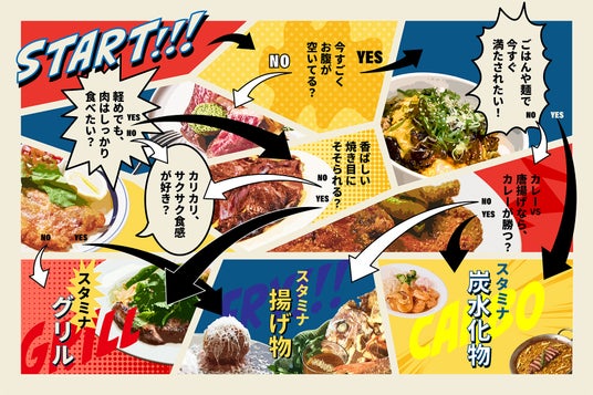 トランジットグループのレストラン&カフェが提供する、夏を乗り切るスタミナ食材を用いた料理から、YES/NOで答えるだけの「スタミナチャート」で、今のあなたに合った一品を見つけてみませんか。