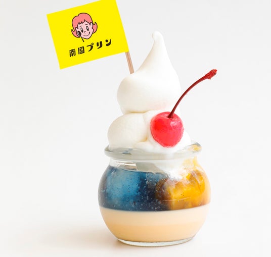 宮崎の透き通った青空を表現したラムネ味の青いプリンに宮崎県産マンゴーをトッピング。甘さ控えめなソフトクリームで仕上げました。