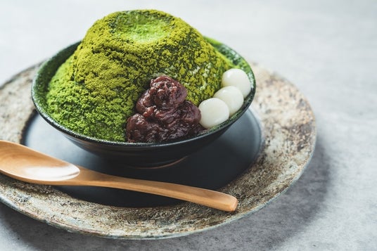 ミルク氷に抹茶をかけ、中にはわらび餅が入っています。