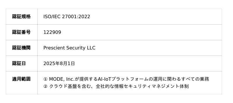 現場業務に特化したAIアプリケーションの先駆けとして、企業の業務効率化と安全性向上を支援するMODE, Inc.(本社:米国カリフォルニア州、日本支店:東京都千代田区、CEO:上田 学、以下、MODE)は、2025年8月1日、情報セキュリティマネジメントシステム(ISMS)の国際規格であるISO/IEC 27001:2022の認証を取得したことをお知らせします。