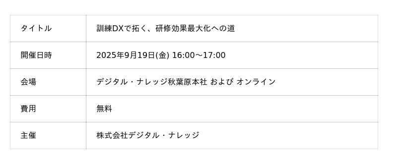 「訓練DXで拓く、研修効果最大化への道」セミナー、秋葉原とオンラインで無料ハイブリッド開催《9/19(金)》