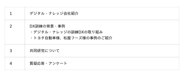 また、参加者の皆様から、より実りのある訓練DXを実現するための研究テーマを募り、共同で研究する企業様を募集いたします。