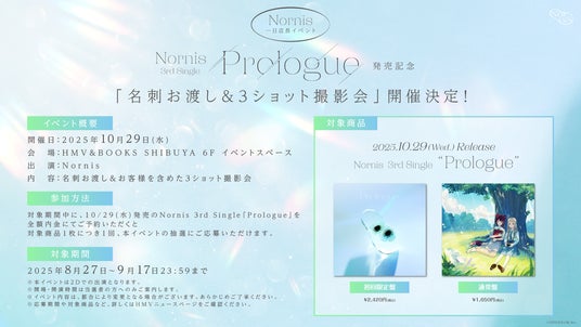3rd Single「Prologue」の発売を記念して、発売日にNornisがHMV&BOOKS SHIBUYAの1日店長に就任いたします。当日は、「名刺お渡し&3ショット撮影会」も開催決定。