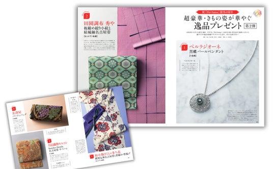皆様に愛されて45年。感謝の気持ちを込めまして、創刊記念号特別プレゼントをご用意しました。美しい訪問着から帯、ジュエリーや和装小物まで、総勢13アイテムをラインアップ。きもの姿を彩る逸品をご覧いただき、ご応募ください。