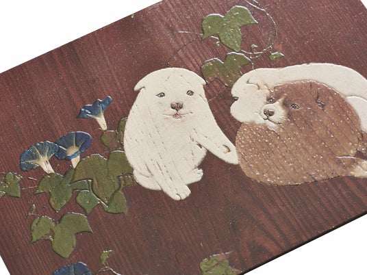 愛知県にあった明眼院の廊下にある杉戸に描かれた作品で、朝顔の咲く風景の中で子犬たちが無邪気に遊ぶ様子が、やさしい目線で描かれています。やわらかい毛並みの子犬の姿にはあえて細かい凹凸をつけず、ふんわりとした丸みをつけて立体化しています。また、背景となる杉戸の木目は、現物に近い風合いを忠実に再現し、まるでそのまま切り取ったようなリアルな質感で仕上げています。作品を包み込む空気感をそのまま閉じ込めた、心あたたまるポストカードです。