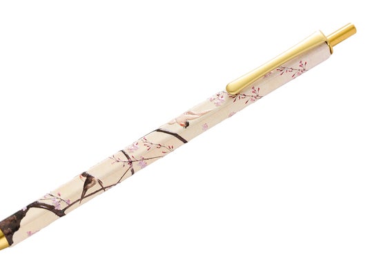 春らしい淡いピンクの桜と、二羽の燕が舞う姿が印象的な、可憐で華やかな印象の一本です。桜の枝は右上から左下へと流れるように配置し、燕が風を切って飛ぶ軽やかな動きと、自然の一瞬の美しさを感じられる構成に仕上げました。花のつぼみや細い枝の細部に至るまで、繊細な起伏をつけて立体化しています。やさしさの中に凛とした佇まいが同居する、春をそのまま纏ったようなデザインで、大人の手元にもなじむ上品なボールペンです。