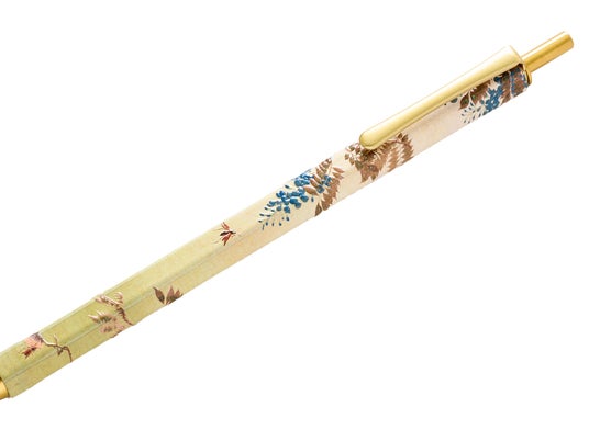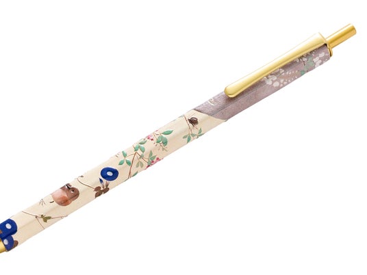銀色に輝く半円形の月に、ゆるやかな曲線を描く萩の枝が重なり、静かに移ろう季節の儚さを映し出した一本です。小鳥や昆虫、草花のつぼみなど、自然の中でひっそりと息づく小さな命に向けられた、作者のやさしい眼差しを意識しながら、一筆ずつ手描きでなぞるように、精緻な凹凸を加えて立体化しています。控えめながらも心に残る美しさがあり、手に取るたびに穏やかな時の流れを感じさせてくれるボールペンです。